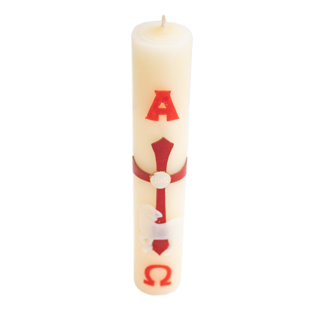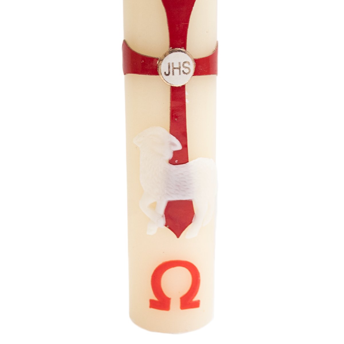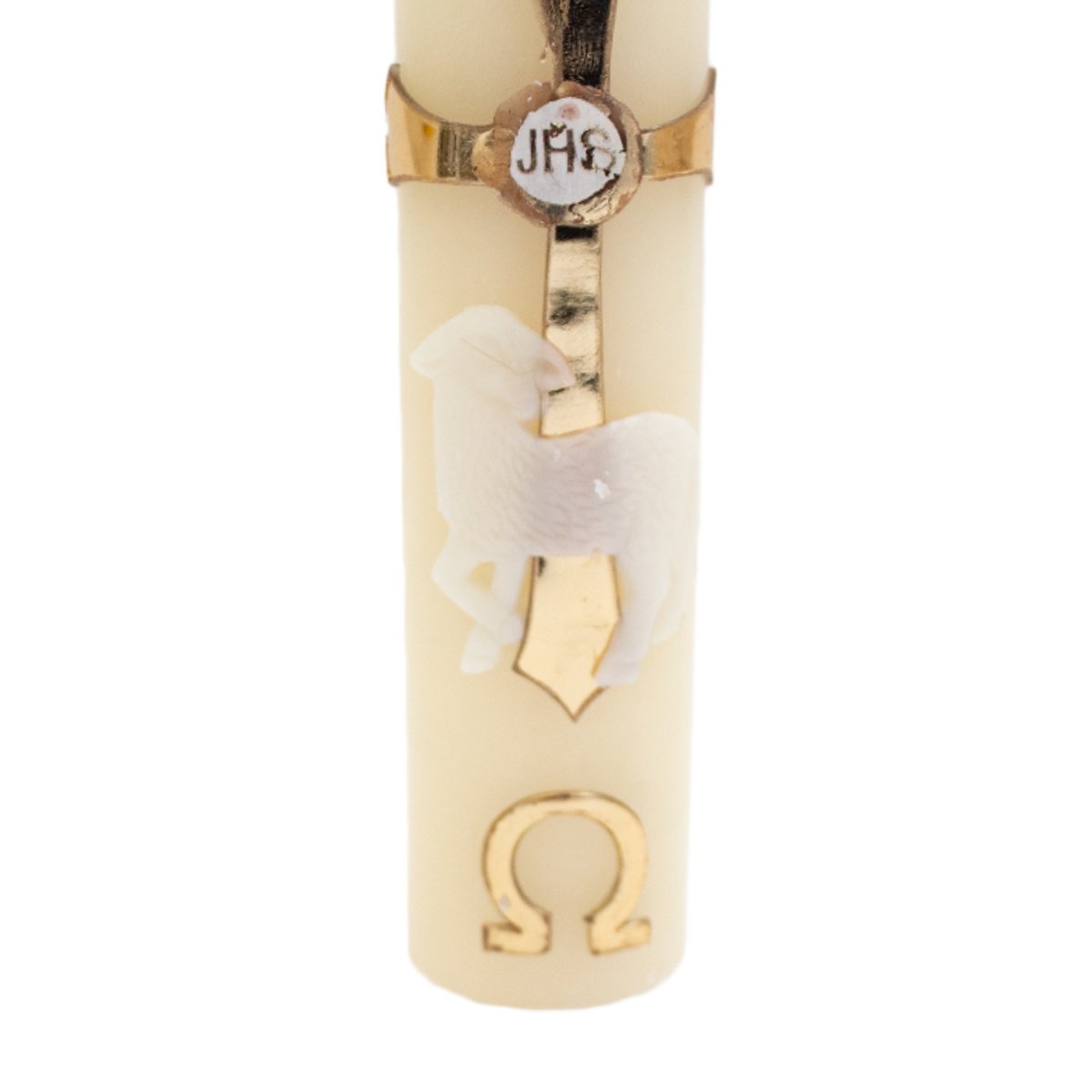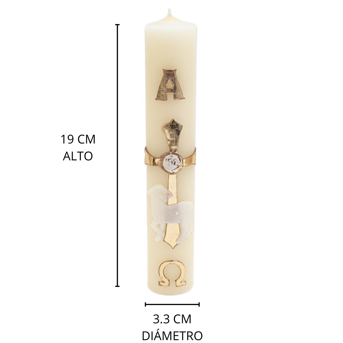 Medidas 3.5 cm x 19 cm de alto Símbolo de Cristo resucitado y su luz que ilumina al mundo, el Cirio Pascual es la vela que se consagra y enciende en la Vigilia Pascual de la liturgia católica de la noche del Sábado Santo y se expone durante cuarenta días que representan el tiempo que pasó Jesucristo entre nosotros desde su resurrección hasta su ascensión al cielo en cuerpo y alma.