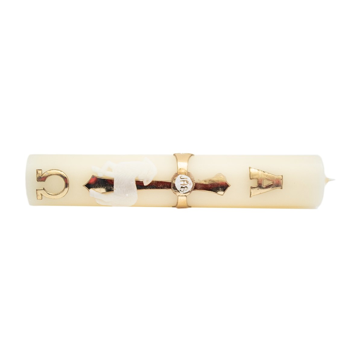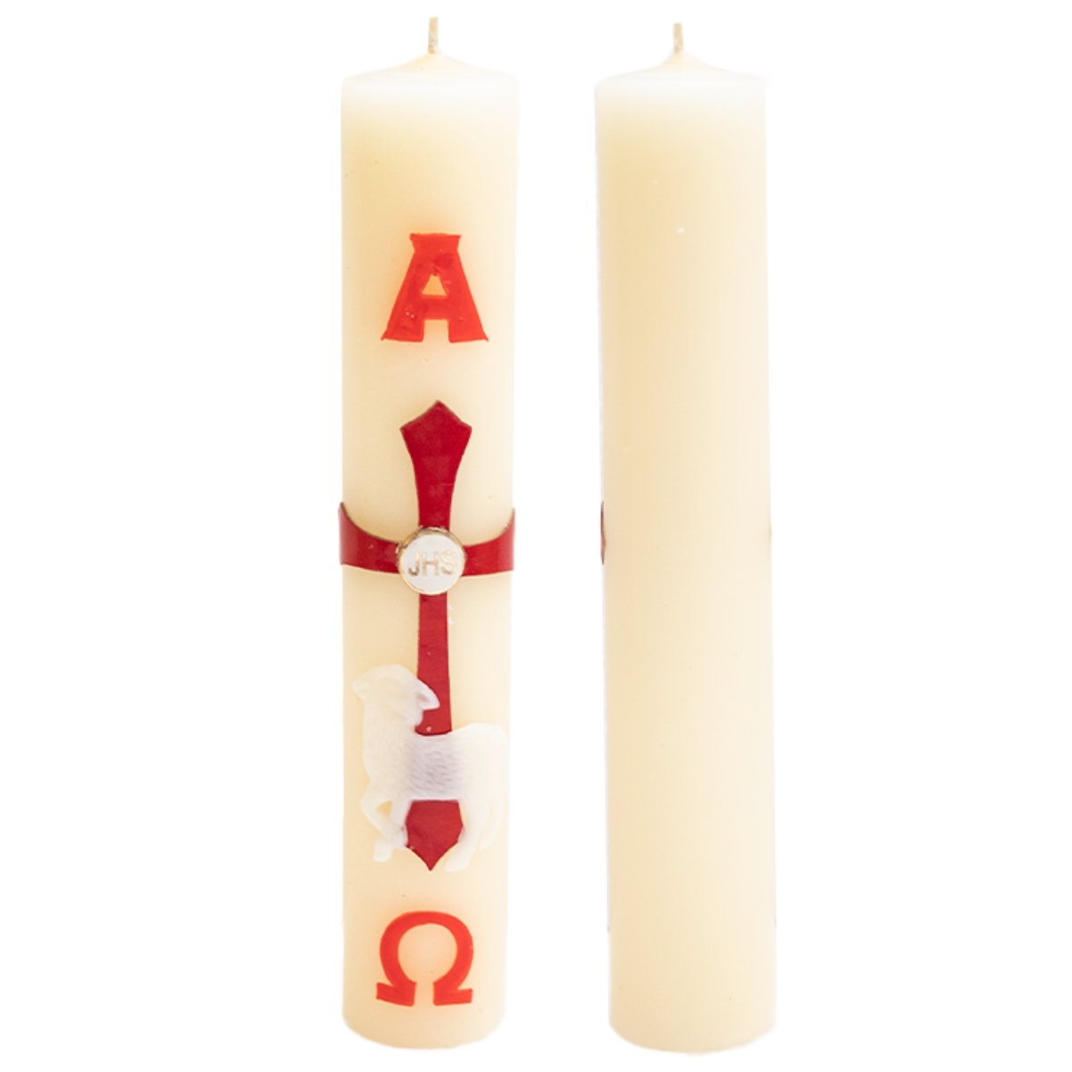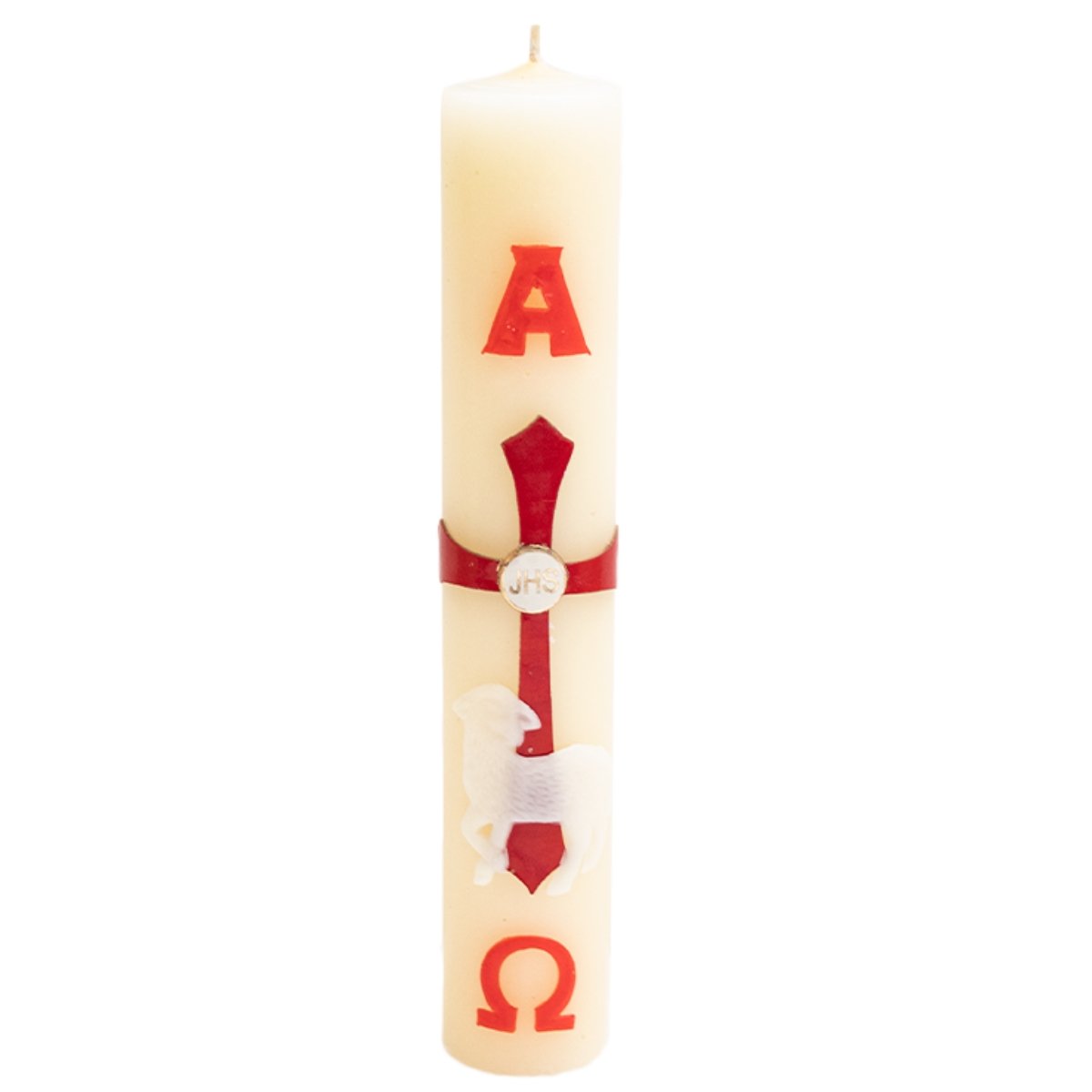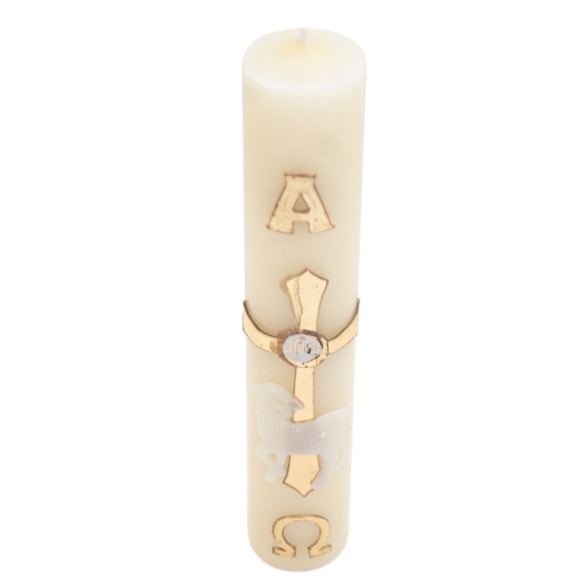 Medidas 3.5 cm x 19 cm de alto Símbolo de Cristo resucitado y su luz que ilumina al mundo, el Cirio Pascual es la vela que se consagra y enciende en la Vigilia Pascual de la liturgia católica de la noche del Sábado Santo y se expone durante cuarenta días que representan el tiempo que pasó Jesucristo entre nosotros desde su resurrección hasta su ascensión al cielo en cuerpo y alma.
