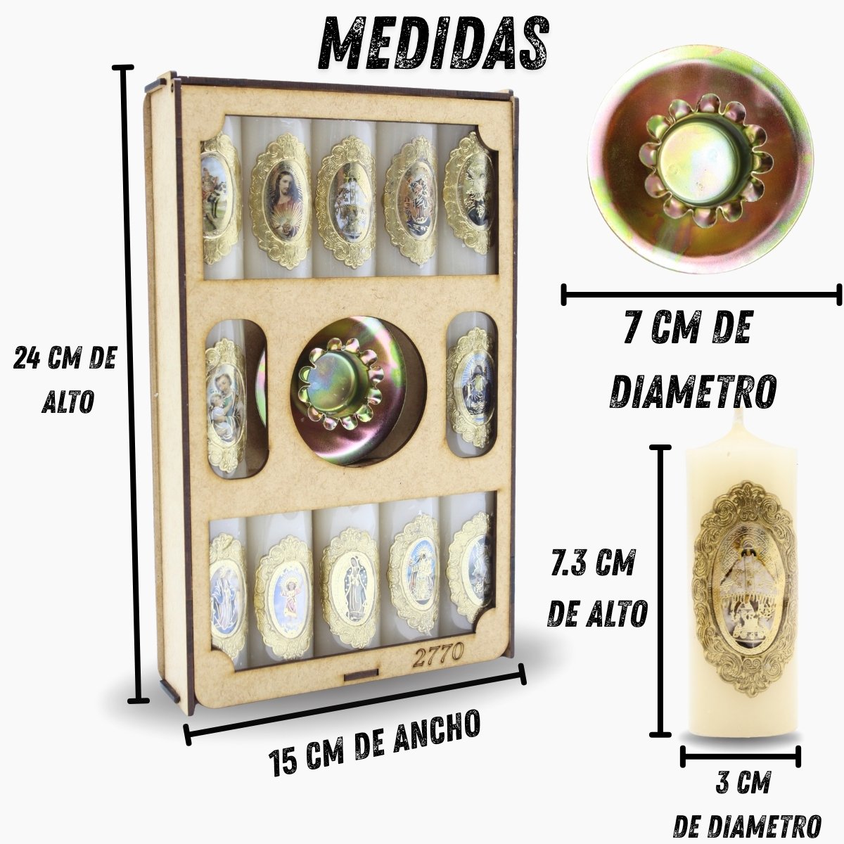 Ideales para obsequio o recuerdos de alguna celebración especial, representan Bendiciones!! Medidas 2.7 cm x 7 cm de alto, incluye un porta vela La Divina Providencia es la intervención de Dios en el universo y en la vida de las personas para guiarlo y cuidarlo según su sabiduría y amor. La Virgen de Guadalupe es una figura religiosa de la Virgen María, venerada en México y América Latina, cuya devoción se centra en la imagen de una joven indígena impresa en la tilma de San Juan Diego.